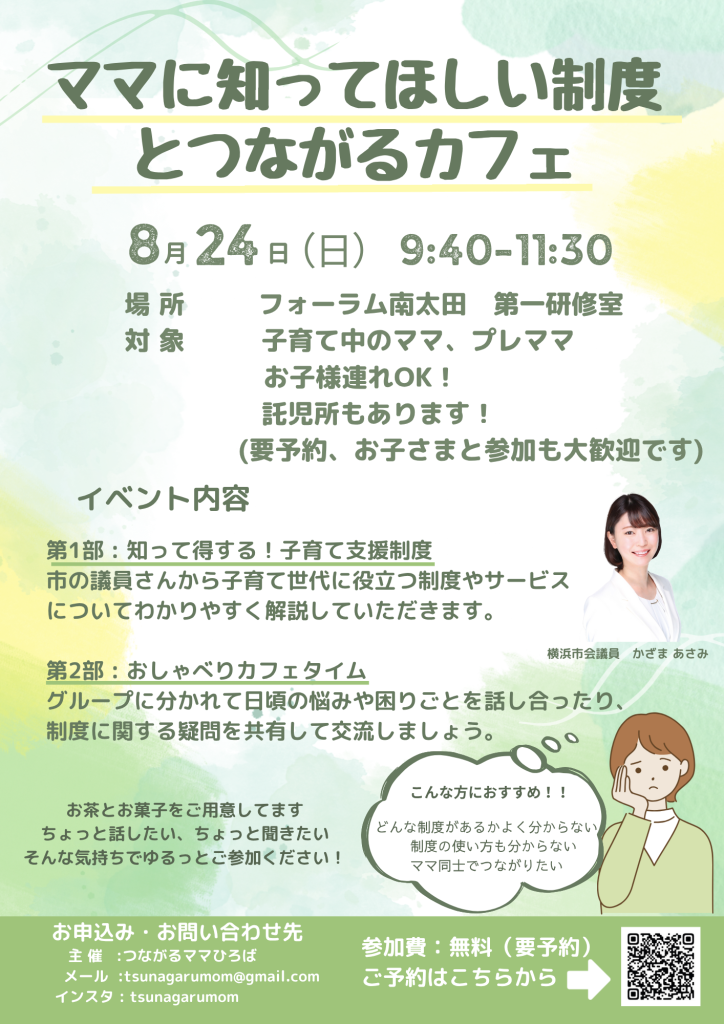 8/24(日)開催の「ママに知ってほしい制度とつながるカフェ」に参加します。