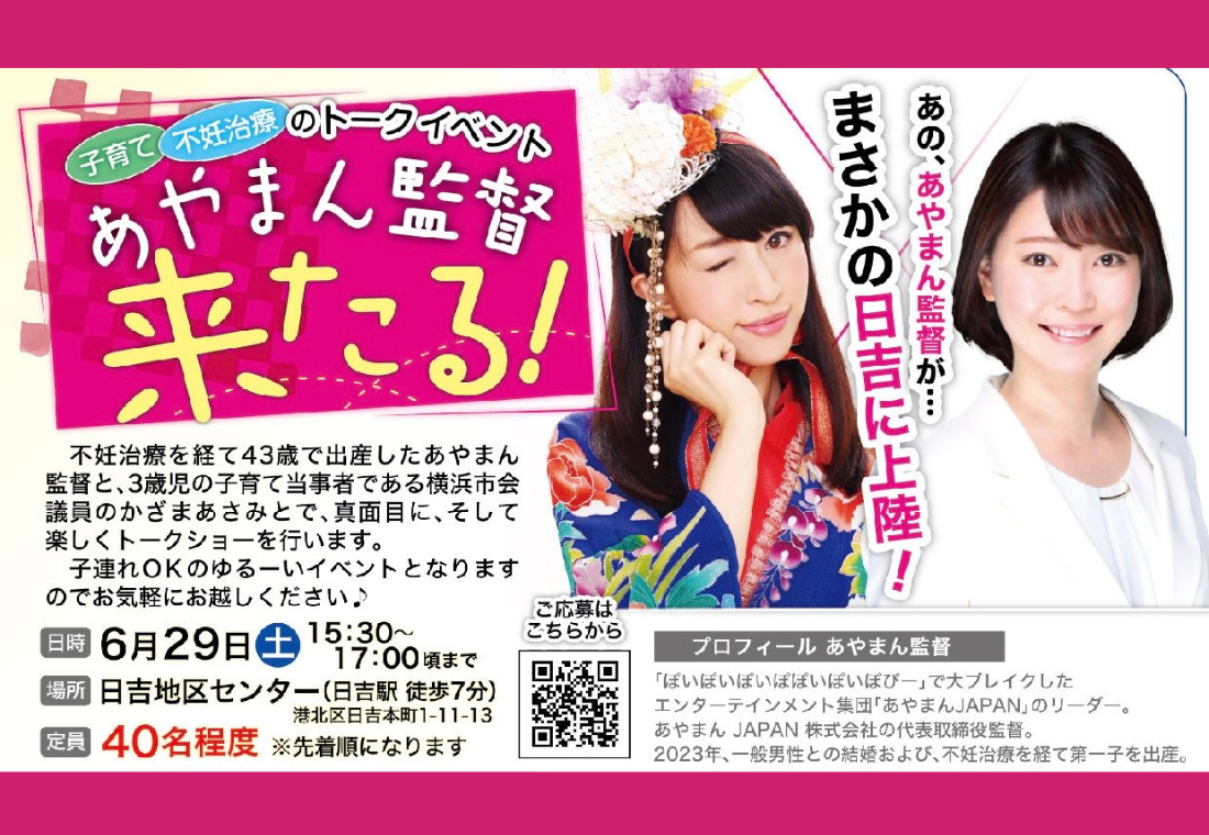 不妊治療を経て43歳で出産したあやまん監督と、3歳児の子育て当事者である横浜市会議員のかざまあさみとで、真面目に、そして楽しくトークショーを行います。